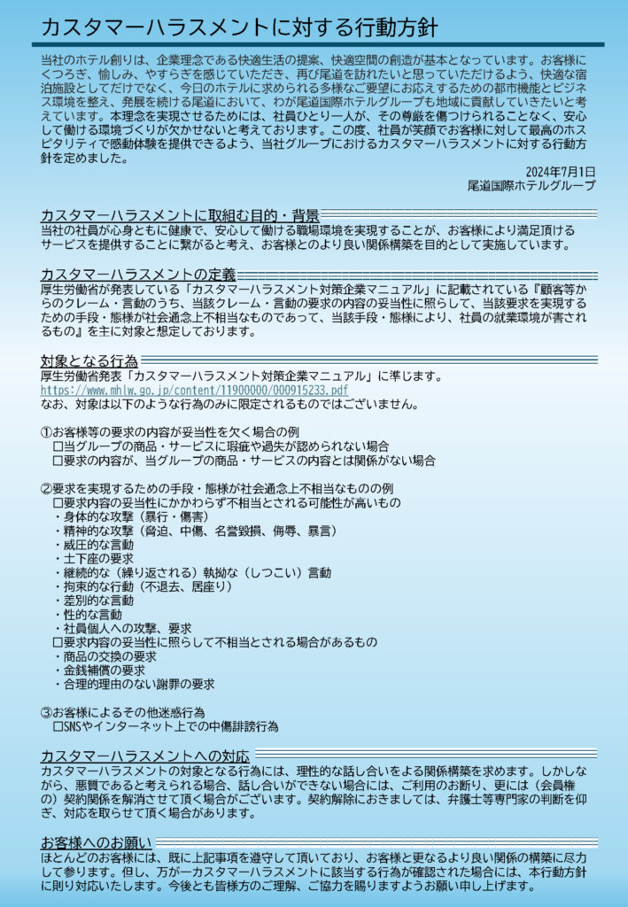 当社のホテル創りは、企業理念である快適生活の提案、快適空間の創造が基本となっています。お客様にくつろぎ、愉しみ、やすらぎを感じていただき、再び尾道を訪れたいと思っていただけるよう、快適な宿泊施設としてだけでなく、今日のホテルに求められる多様なご要望にお応えするための都市機能とビジネス環境を整え、発展を続ける尾道において、わが尾道国際ホテルグループも地域に貢献していきたいと考えています。本理念を実現させるためには、社員ひとり一人が、その尊厳を傷つけられることなく、安心して働ける環境づくりが欠かせないと考えております。この度、社員が笑顔でお客様に対して最高のホスピタリティで感動体験を提供できるよう、当社グループにおけるカスタマーハラスメントに対する行動方針を定めました。