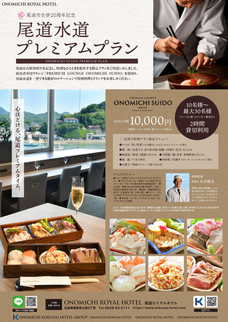 尾道ロイヤルホテルでは、尾道市合併20周年を記念して、尾道水道を望むプレミアムラウンジを2時間貸切でご利用いただける特別プランを販売しています。小規模ご会食・ご懇親会に最適です。