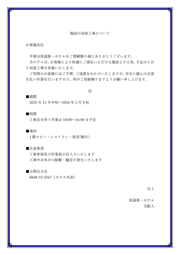 当ホテルは、お客様により快適にご滞在いただける施設とする為、下記のとおり改装工事を実施いたします。