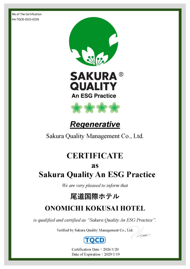 山陽工業株式会社が運営する「尾道国際ホテル」は、2026年1月20日、SDGsを実践する宿泊施設の国際認証 「Sakura Quality An ESG Practice(通称:サクラクオリティグリーン)」のレベル4「4御衣黄(ぎょいこう)ザクラ」を取得いたしました。